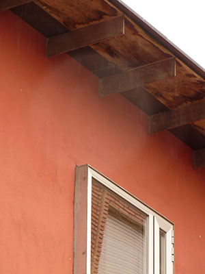 La parte superior se resuelve con una pequeña cornisa, metalica con canecillos de pletina metalica, que reproducen el ritmo de los canecillos de madera de la casa contigüa.