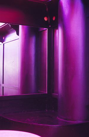 La organización del local está determinada por su forma en planta y por los pilares. La zona de la barra y de estancia sentados está determinada por estos. Interiormente se diferencian cuatro zonas con techos a distintas alturas que singularizan cada espacio. Un zócalo negro de dos metro de altura recorre todo el local. Un espejo por encima de este zócalo y hasta el techo, al fondo del local, duplica la dimensión de la zona de mesas.