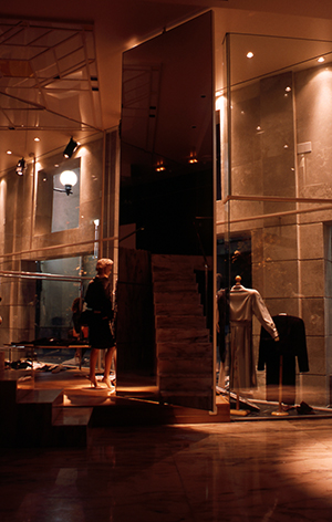 El escaparate se eleva ligeramente sobre el nivel de la tienda y se separa por un espejo giratorio de 5 metros de altura que permite también su utilización como probador.