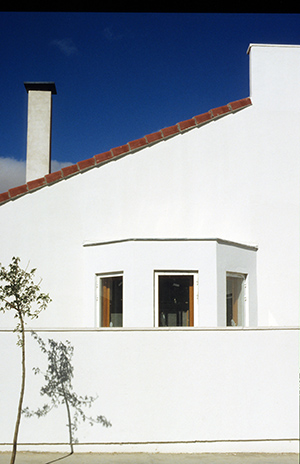 La vivienda se construye ocupando el lateral derecho de la parcela, dejando 4 metros a la calle y 3 metros al lateral izquierdo. El salón se comunica con la calle a través de un mirador que se abre al jardín delantero. La puerta de entrada queda oculta y próxima la entrada al garaje. Las dependencias se organizan en dos niveles con una planta en forma de L cerradas a la calle dado el poco interés de esta. Esta disposición da lugar a una zona exterior cubierta con una pérgola a la que se abre el salón-comedor y la cocina. El resto de la parcela se deja de jardín.
