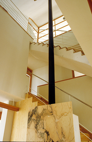 La disposición de la vivienda dentro de la parcela se decide en función de las dependencias de la planta baja y su relación con el exterior. Las zonas de estar y cocina tienen una continuidad en el exterior con espacios con distintos tratamientos y escalas. Dado el poco interés del entorno inmediato, las dependencias de la planta baja se relacionan visualmente solo con la parcela, donde se ha cuidado especialmente la jardinería y la disposición de las plantaciones. En las plantas superiores se ha buscado la relación visual con los puntos de más interés del entorno más lejano. Volumetricamente es prácticamente un cubo, cerrado a la calle y con un mirador de dos plantas que permite una visión en profundidad de toda la parcela.